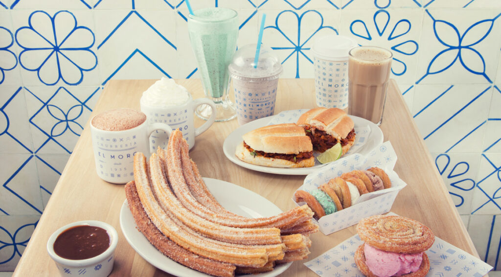 La churrería El Moro, de larga tradición, ofrece exquisitos churros con relleno de chocolate, leche condensada o cajeta. También chocolate caliente, malteadas, sándwich de churro y helado, y tortas al pastor o pierna con mole.