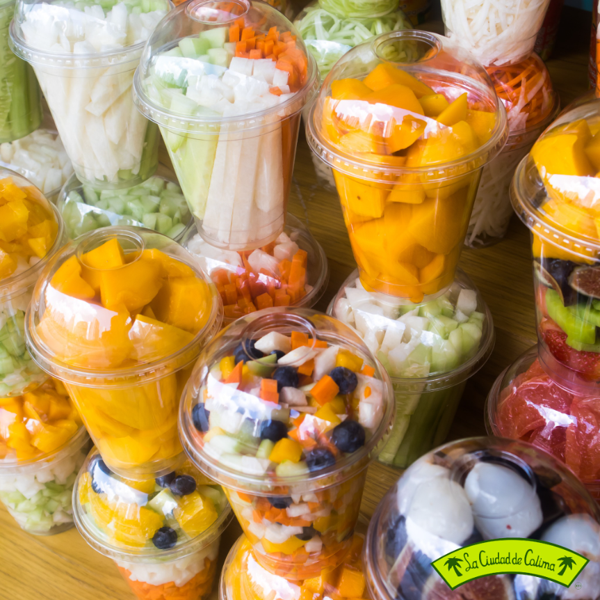 Opciones saludables: copas de frutas, ensaladas con diversos aderezos y jugos.
