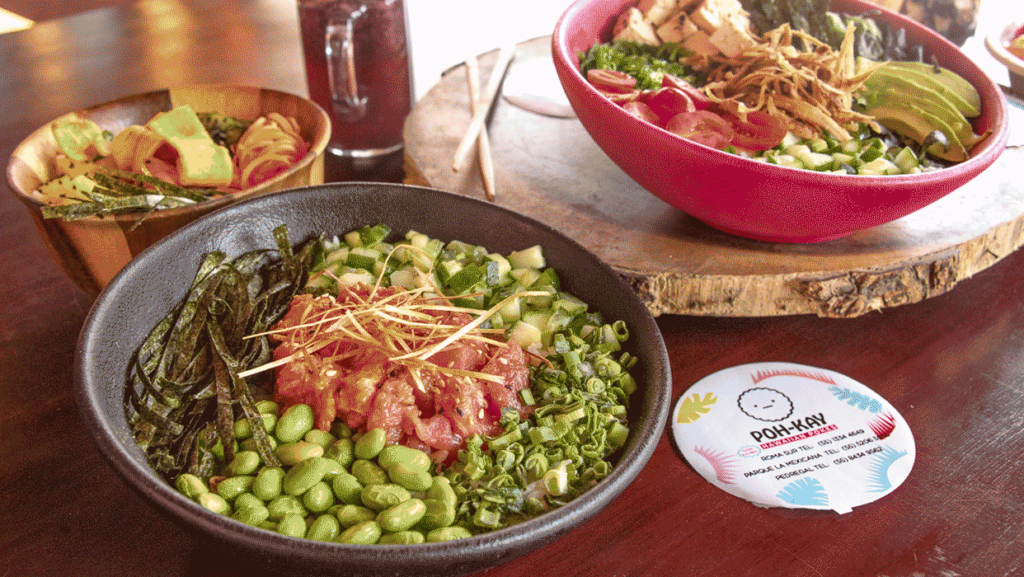 Ofrece una gran variedad de bowls con una base (arroz, mix de lechugas y quinoa), proteína (atún, camarón, ceviche, pollo o salmón), toppings (aguacate, jitomate Cherry, etc.), crunchies (ajonjolí, cebolla frita o chips) y alguna salsa de tu elección para acompañar.